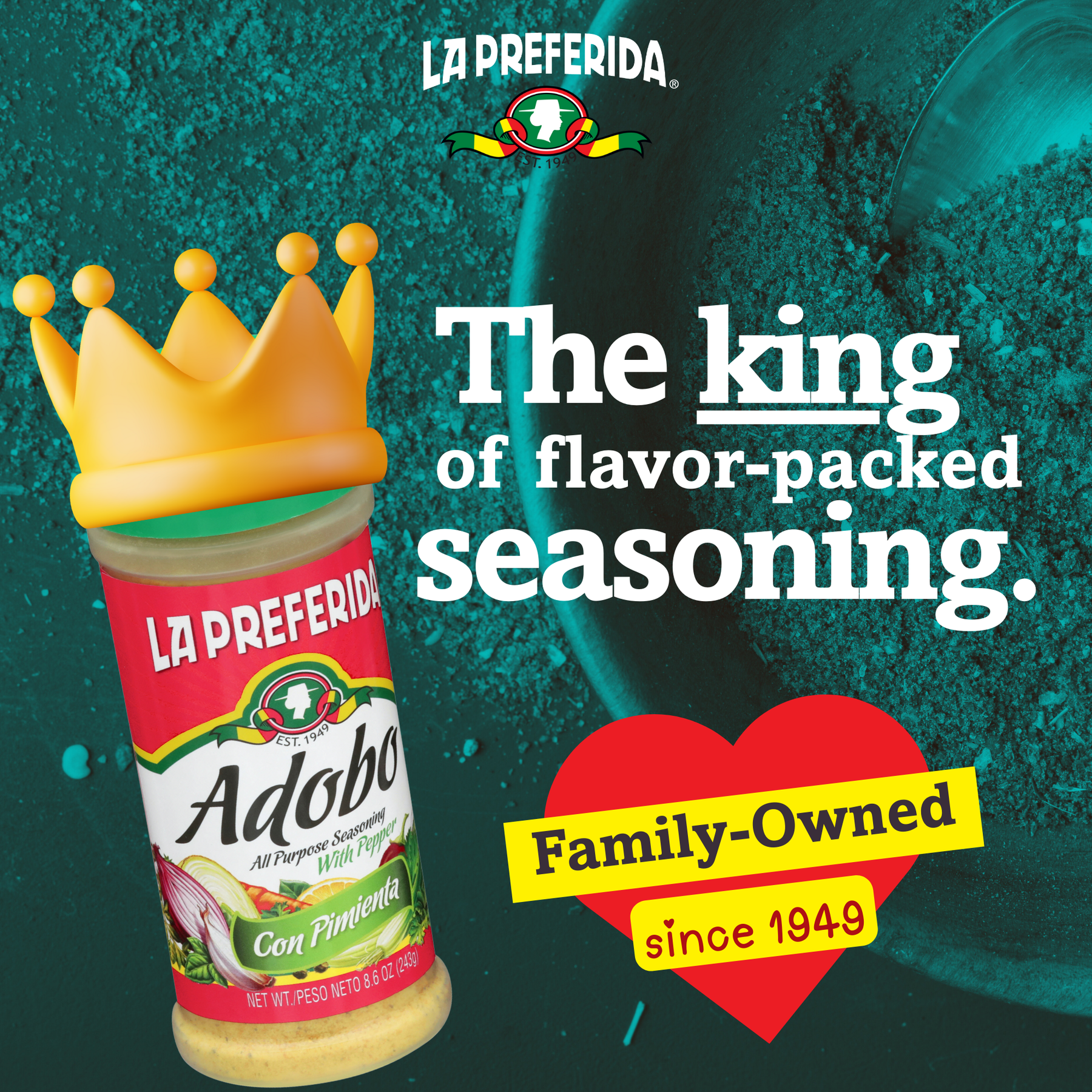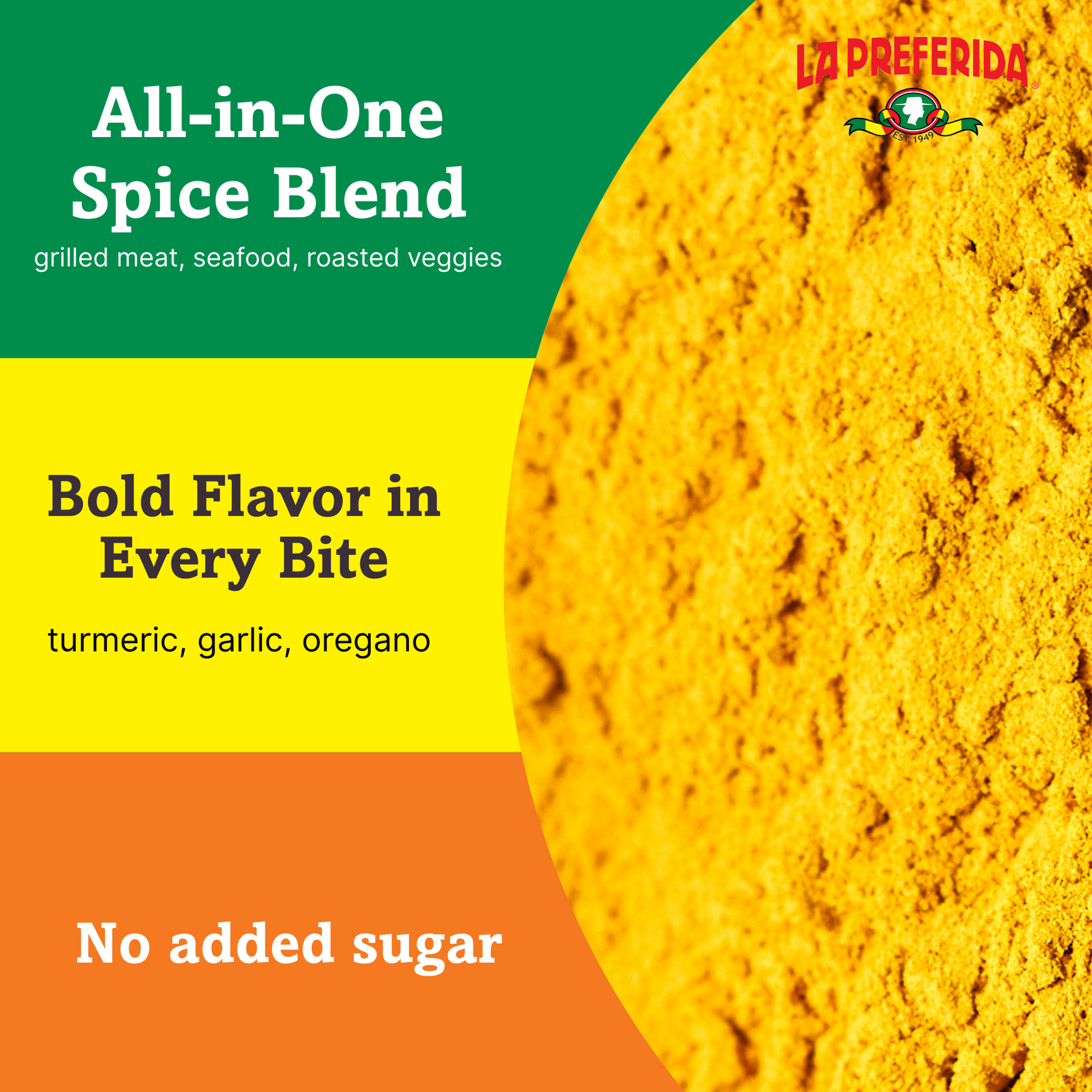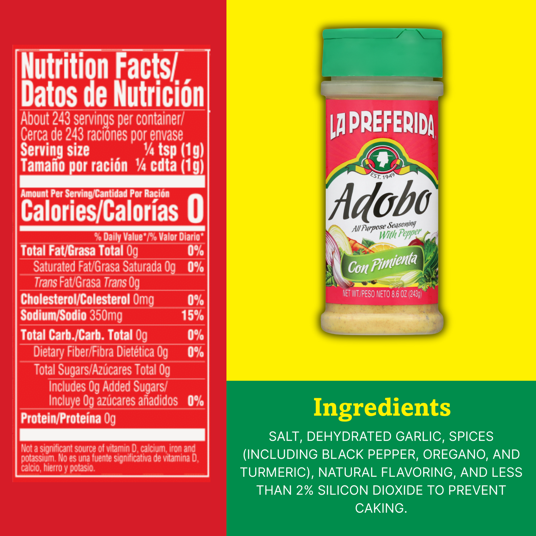 La Preferida Adobo Con Pimienta is a bold, savory blend of garlic, oregano, turmeric, and black pepper designed to season just about everything — meats, seafood, vegetables, beans, and soups.